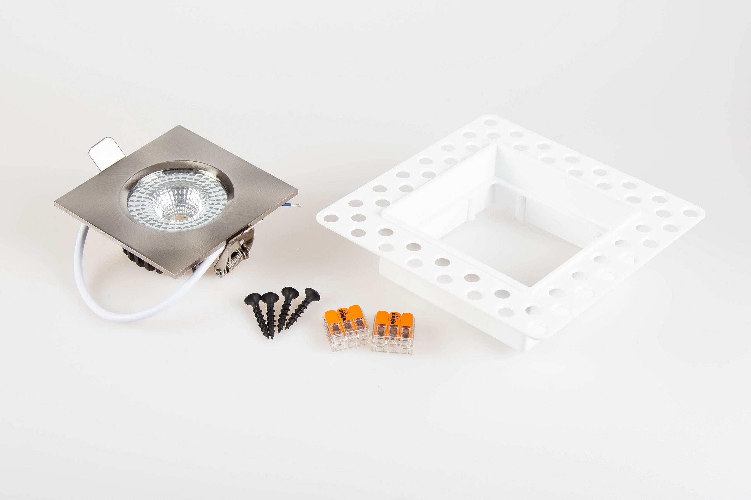 Elk pakket wordt geleverd met een spotring, spotje, lasklemmen, schroeven en een handige gebruiksaanwijzing. Tevens een gratis zuignap meegeleverd.